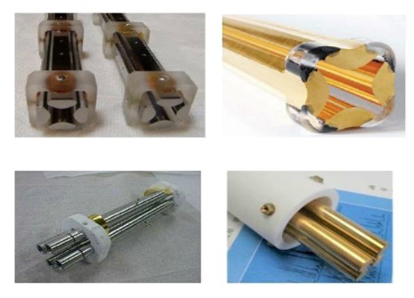 Итак, вот от «каши» остался лишь пучок однозарядных положительных ионов разной массы. Ионная оптика направляет этот пучок в ещё более глубокий вакуум (10 -6 мм рт. ст.) на вход в квадруполь – масс-анализатор, "сердце" ИСП-МС. Квадруполь – это 4 длинных молибденовых стержня, расположенных параллельно друг другу, по углам воображаемого квадрата. Ионный пучок запускается в центр этого квадрата. Комбинация заданного переменного и постоянного напряжений на стержнях квадруполя создаёт условие для сквозного пролёта от начала и до конца квадруполя только для определённого иона в определённый момент времени (например m/z=7 для Li) – только ион заданного масс-заряда долетит до конца квадруполя и попадёт на детектор, все остальные отклонятся и будут откачаны вакуумом. При практически мгновенном изменении этих напряжений условие сквозного пролёта меняется, например, с m/z 7 (Li) на m/z 9 (Be), а затем на следующий анализируемый ион и так далее по всем элементам, которые нас интересуют.